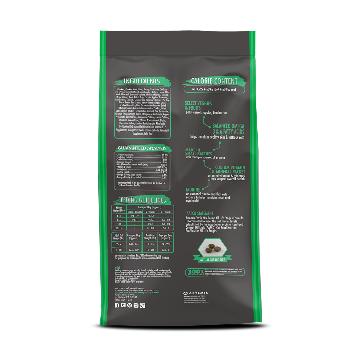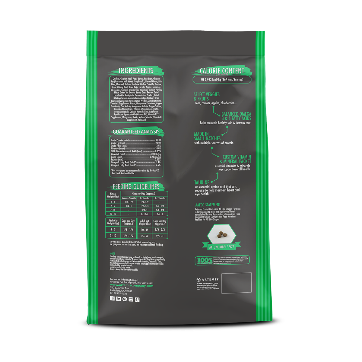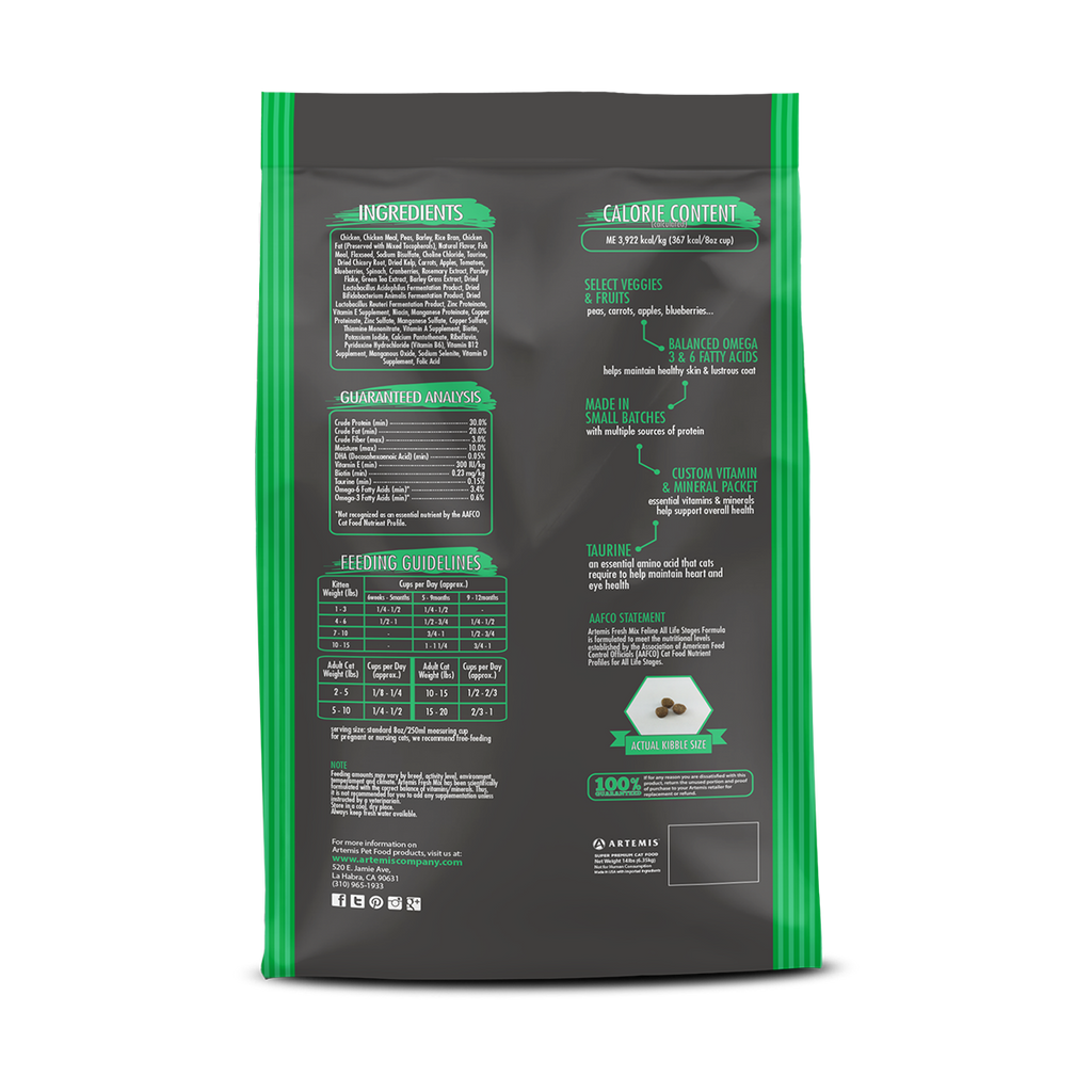 Chicken, Chicken Meal, Peas, Barley, Rice Bran, Chicken Fat (Preserved with Mixed Tocopherols), Fish Meal, Natural Flavor, Flaxseed, Sodium Bisulfate, Choline Chloride, Taurine, Dried Chicory Root, Dried Kelp, Carrots, Apples, Tomatoes, Blueberries, Spinach, Cranberries, Rosemary Extract, Parsley Flake, Green Tea Extract, Barley Grass, L-Carnitine, Dried Lactobacillus acidophilus fermentation product, dried Bifidobacterium animalis fermentation product, dried Lactobacillus reuteri fermentation product, Zinc Proteinate, Vitamin E Supplement, Niacin, Manganese Proteinate, Copper Proteinate, Zinc Sulfate, Manganese Sulfate, Copper Sulfate, Thiamine Mononitrate, Vitamin A Supplement, Biotin, Potassium Iodide, Calcium Pantothenate, Riboflavin, Pyridoxine Hydrochloride (vitamin B6), Vitamin B12 Supplement, Manganous Oxide, Sodium Selenite, Vitamin D Supplement, Folic Acid.ds