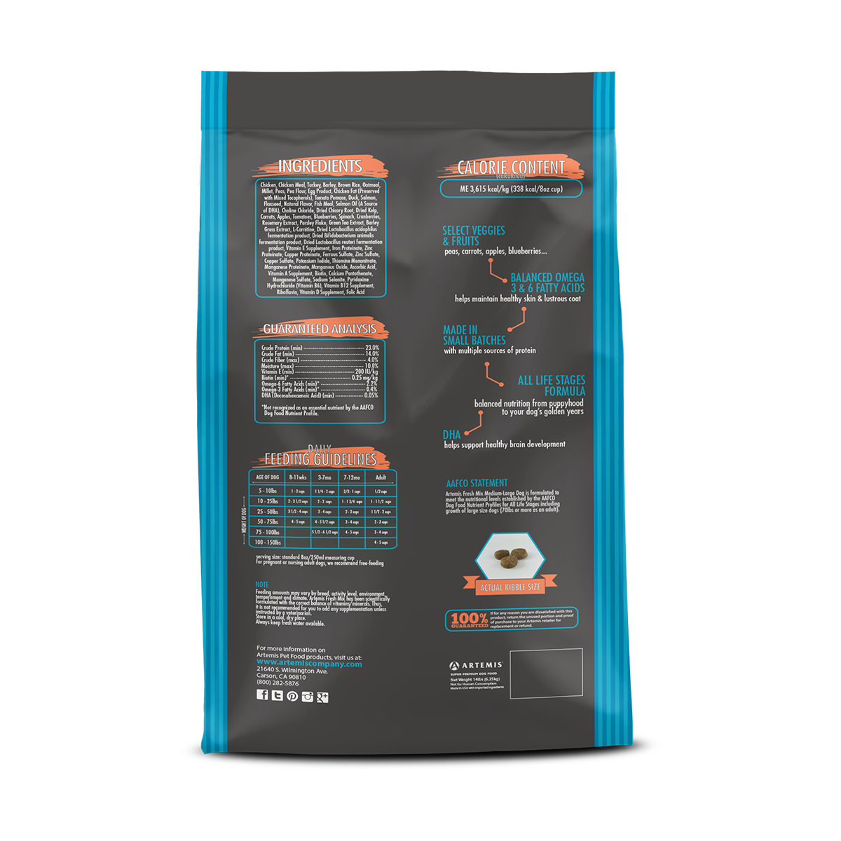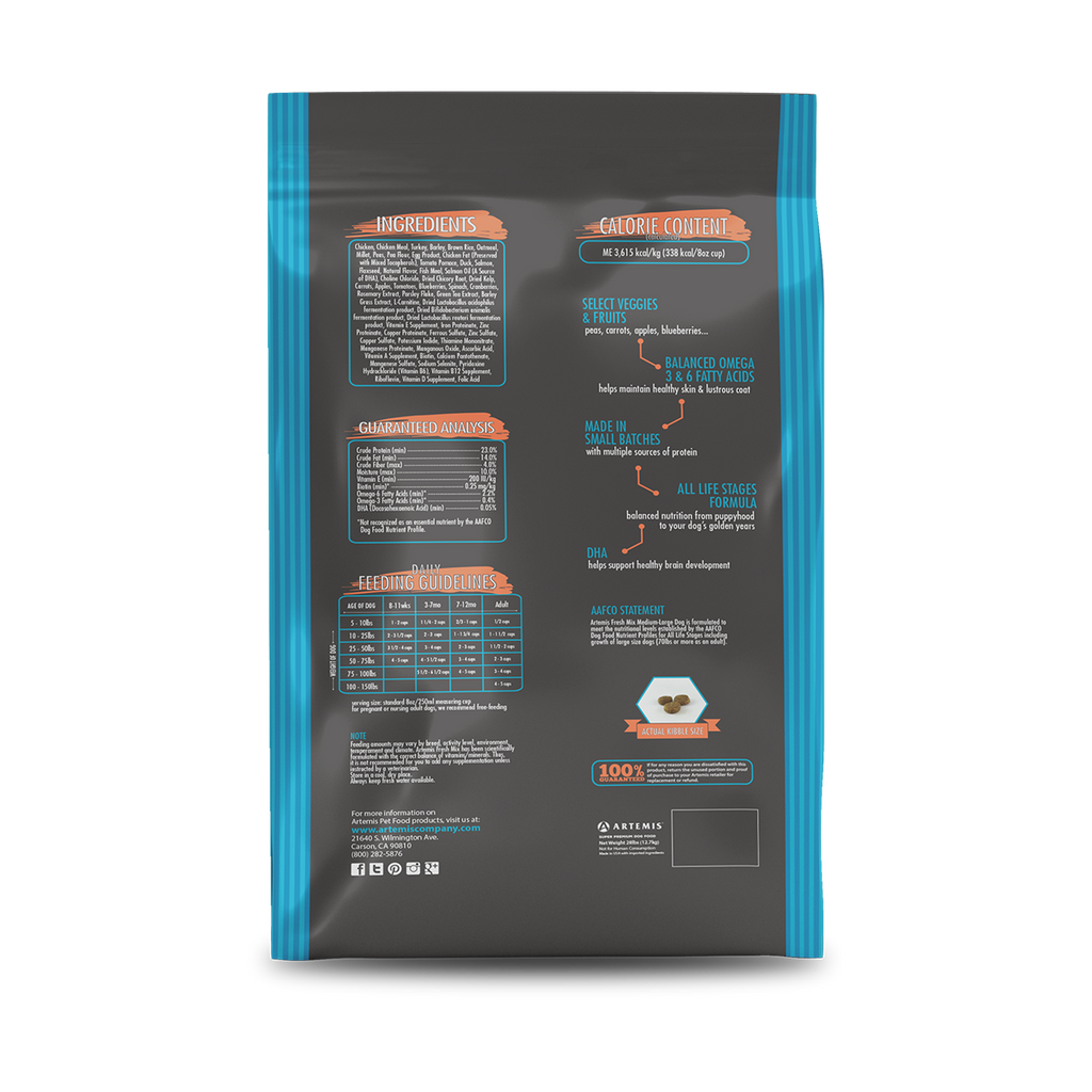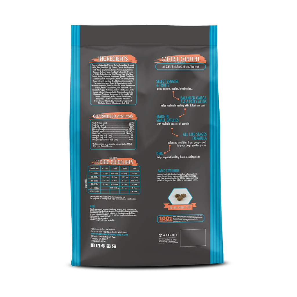 Chicken, Chicken Meal, Turkey, Barley, Brown Rice, Oatmeal, Millet, Peas, Pea Flour, Egg Product, Chicken Fat (Preserved with Mixed Tocopherols), Tomato Pomace, Duck, Salmon, Flaxseed, Natural Flavor, Fish Meal, Salmon Oil (A Source of DHA), Choline Chloride, Dried Chicory Root, Dried Kelp, Carrots, Apples, Tomatoes, Blueberries, Spinach, Cranberries, Rosemary Extract, Parsley Flake, Green Tea Extract, Barley Grass Extract, L-Carnitine, Dried Lactobacillus acidophilus fermentation product, dried Bifidobacterium animalis fermentation product, dried Lactobacillus reuteri fermentation product, Vitamin E Supplement, Iron Proteinate, Zinc Proteinate, Copper Proteinate, Ferrous Sulfate, Zinc Sulfate, Copper Sulfate, Potassium Iodide, Thiamine Mononitrate, Manganese Proteinate, Manganous Oxide, Ascorbic Acid, Vitamin A Supplement, Biotin, Calcium Pantothenate, Manganese Sulfate, Sodium Selenite, Pyridoxine Hydrochloride (vitamin B6), Vitamin B12 Supplement, Riboflavin, Vitamin D Supplement , Folic acid.ds